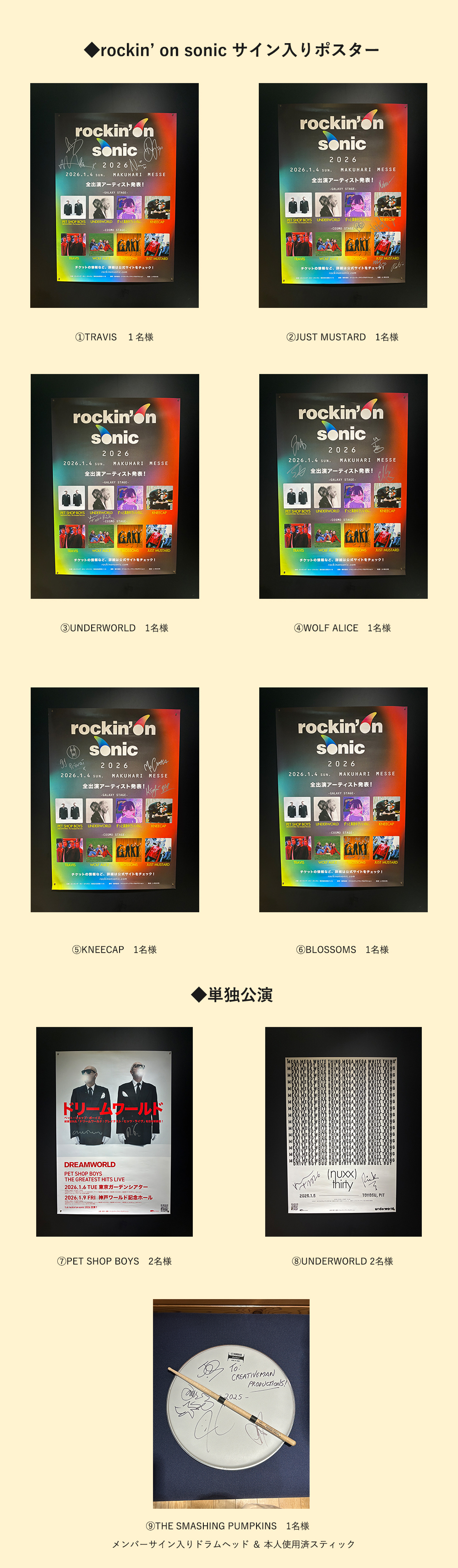 今月の3A会員プレゼントは、ニューイヤー洋楽フェス rockin'on sonicよりアーティストサイン入りポスターのほか、フェスティバル後に単独公演を開催したPET SHOP BOYS、UNDERWORLD のサイン入りポスターを11名様にプレゼント!